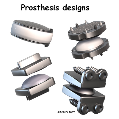 Replacing the damaged disc with an artificial disc, or implant, called a prosthesis can restore the normal distance between the two vertebrae. The artificial disc sits between the two vertebrae and "jacks up" the upper vertebra. Enlarging the disc space relieves pressure on the facet joints. It also opens up the space around the spinal nerve roots where they pass through the neural foramina.