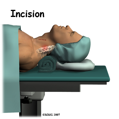 The operation is done from the anterior (front) of the body. This surgical approach is the same as that presently used for a discectomy and fusion operation. To do this, the patient is placed on his or her back. An incision is made through the skin and the thin muscles of the front of the neck. The blood vessels, the trachea (windpipe), and the esophagus are moved to the side so that the surgeon can see the front of the cervical spine. The disc that is to be replaced is identified using the fluoroscope. The fluoroscope is an x-ray machine that allows the doctor to actually see an x-ray image while doing the procedure.