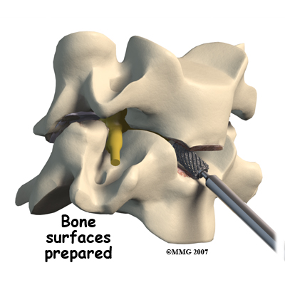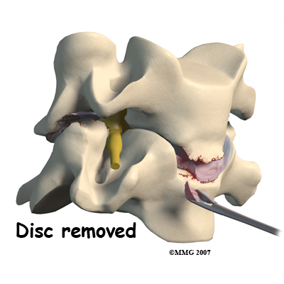 Working from the front of the spine, the spine surgeon removes a large section from the middle of the damaged disc. Next, the bones of the spine are spread apart to make more room to see and work inside the disc space. Using a surgical microscope, any remaining disc material toward the back of the disc is removed. The surgeon will also remove any disc fragments pressing against the nerve and shave off any osteophytes (bone spurs).