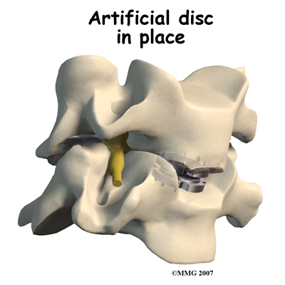 The artificial disc is inserted in the space between two vertebrae. The goal is to replace the diseased or damaged disc while keeping your normal neck motion. The hope is that your spine will be protected from similar problems above and below the affected spinal level.