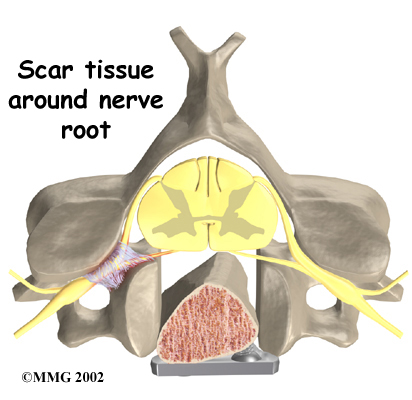 Any surgery that is done near the spinal canal can potentially cause injury to the spinal cord or spinal nerves. Injury can occur from bumping or cutting the nerve tissue with a surgical instrument, from swelling around the nerve, or from the formation of scar tissue. An injury to these structures can cause muscle weakness and a loss of sensation to the areas supplied by the nerve.