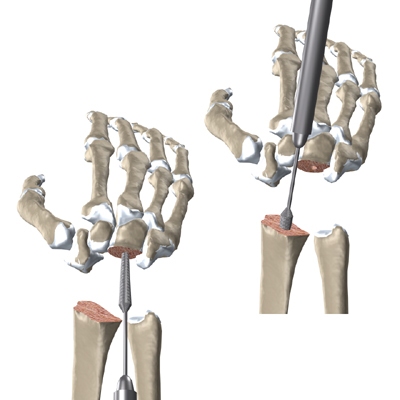 The hand bones and the radius bone of the forearm are then prepared with special rasps. The rasps are used to: