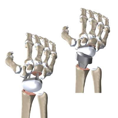 The part that replaces the small wrist bones is called the distal component. This piece is made completely of metal. It is globe shaped to fit into the plastic socket on the end of the radius. The metal distal component is attached by two metal stems that fit into the hollow bone marrow cavities of the carpal and metacarpal bones of the hand.