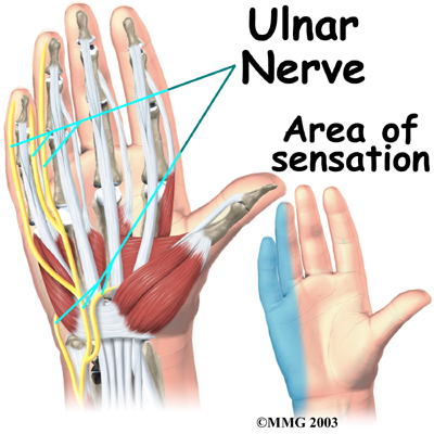 After passing through the canal, the ulnar nerve branches out to supply feeling to the little finger and half the ring finger.